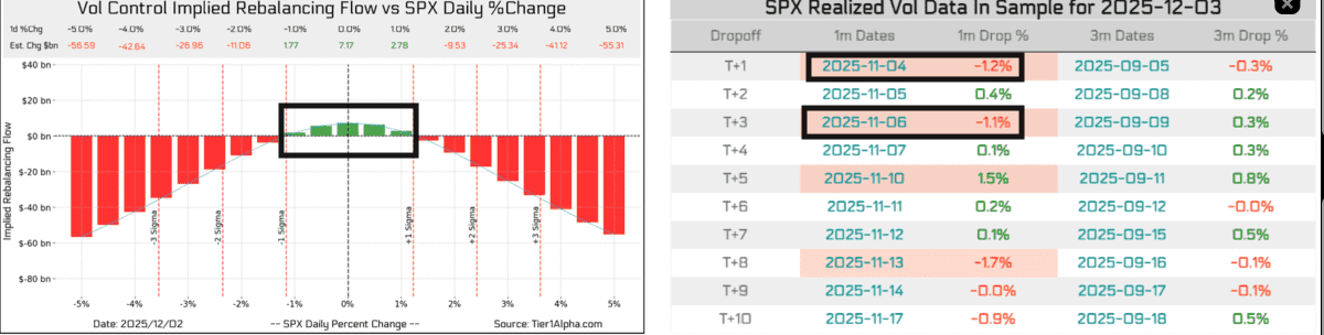 El flujo implícito combinado de los fondos de control de volatilidad y los CTA este miércoles fue de unos 15.000 millones de dólares, a medida que la volatilidad realizada a un mes cayó, incorporando un rendimiento del 1,2% en su muestra histórica… con la próxima ola de flujos llegando este viernes.