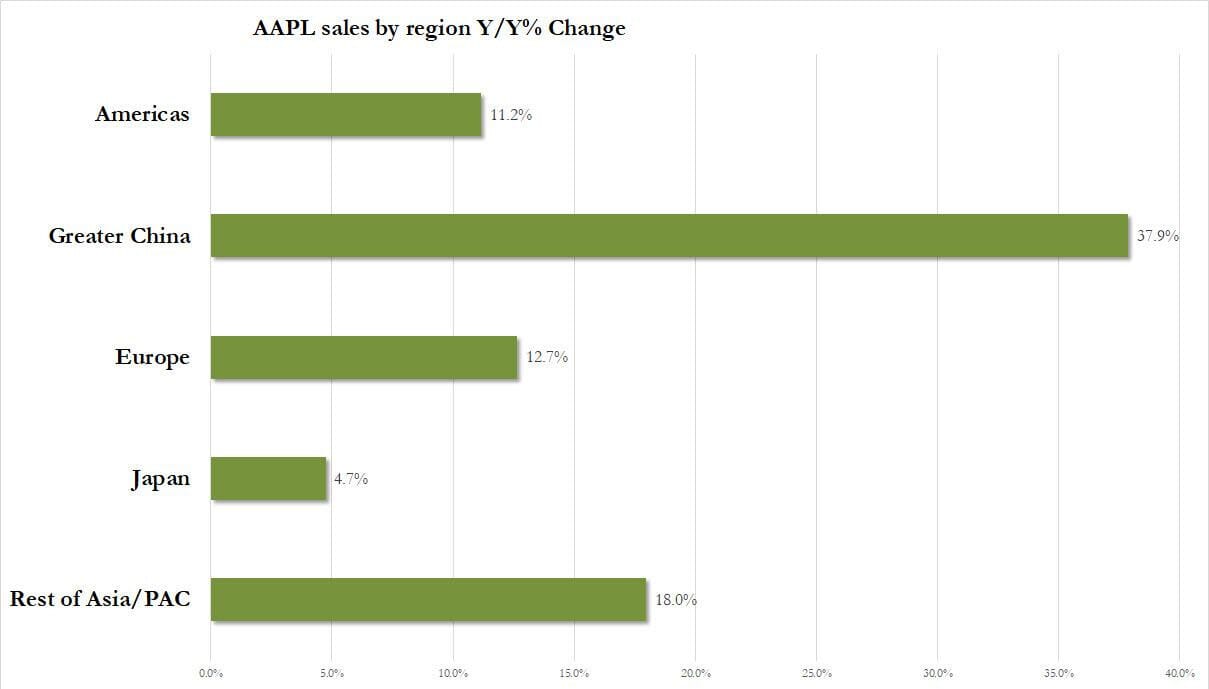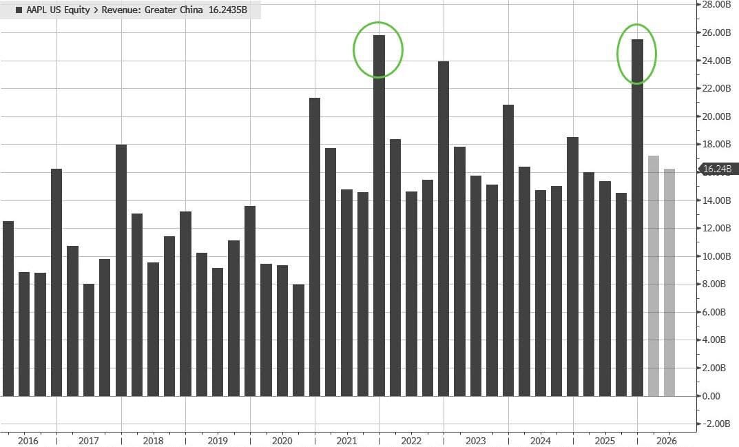 Ingresos de la Gran China: 25.530 millones de dólares, un aumento del 38 % interanual, superando con creces la estimación de 21.820 millones de dólares