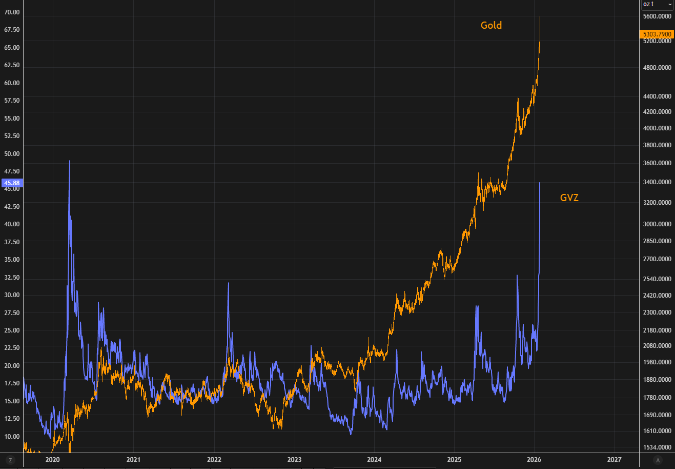 El precio del oro estaba subiendo muy rápido, y con eso la volatilidad ya había aumentado. Hoy el oro ha caído bruscamente, y eso ha hecho que la volatilidad se dispare aún más.