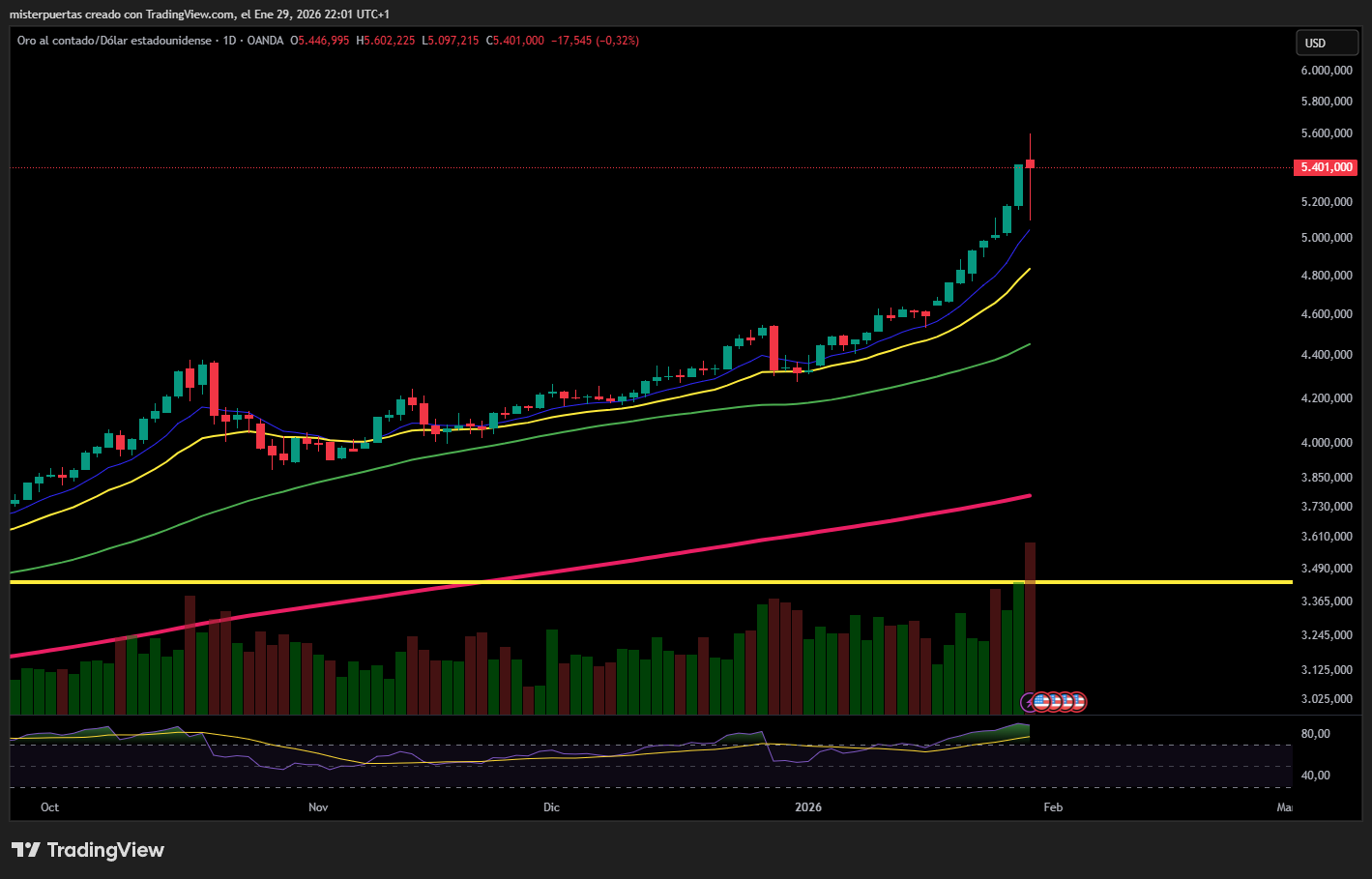 El oro llegó a situarse a pocos dólares de los 5.600 $, antes de desplomarse cerca de 500 $, en un movimiento extremadamente violento.