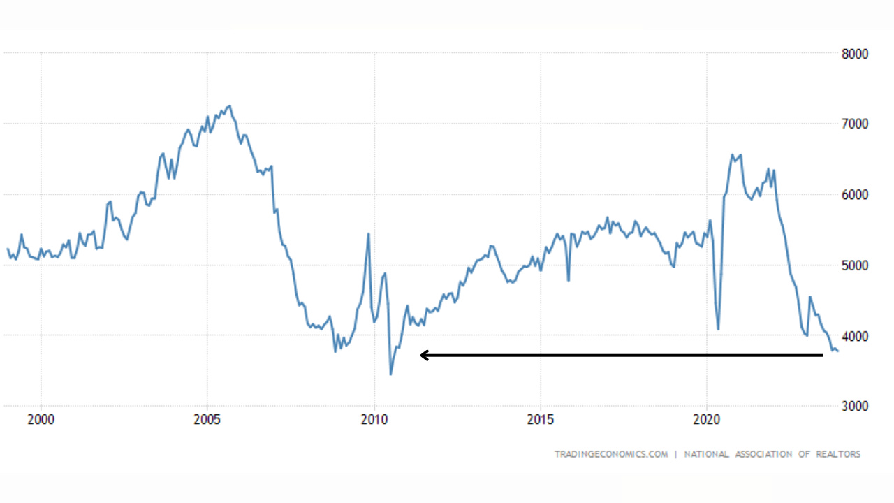 El nivel más bajo desde agosto de 2010 y situándose por debajo de los 3,82 millones de unidades previstos por el mercado. Considerando el año completo 2023, las ventas de viviendas existentes cayeron al nivel más bajo en casi 30 años.