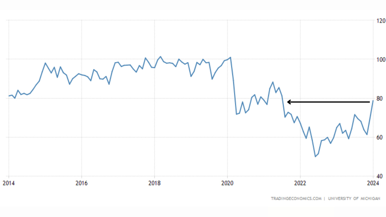 El índice de sentimiento del consumidor de la Universidad de Michigan para los Estados Unidos se disparó a 78.8 en enero de 2024, el más alto desde julio de 2021.
