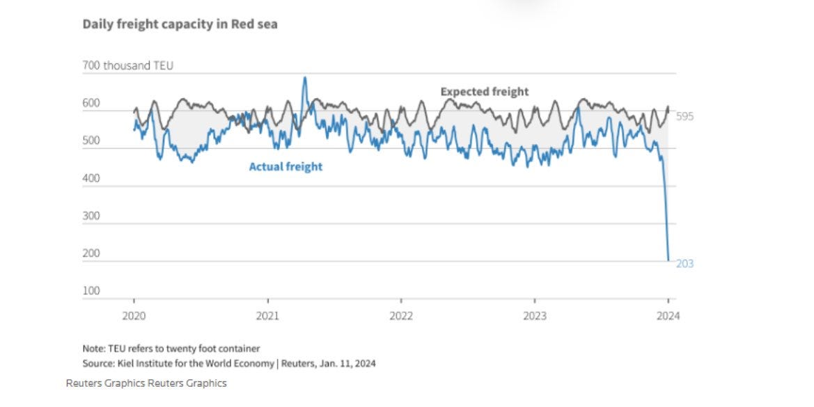 1- ".. El volumen de contenedores de carga en el Mar Rojo ha descendido un 65% respecto a los niveles habituales.." (vía GS)