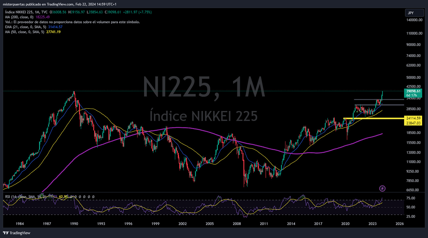 4- Japón entra en recesión la semana pasada. El Nikkei japonés alcanza hoy su máximo histórico, después de 34 años!!