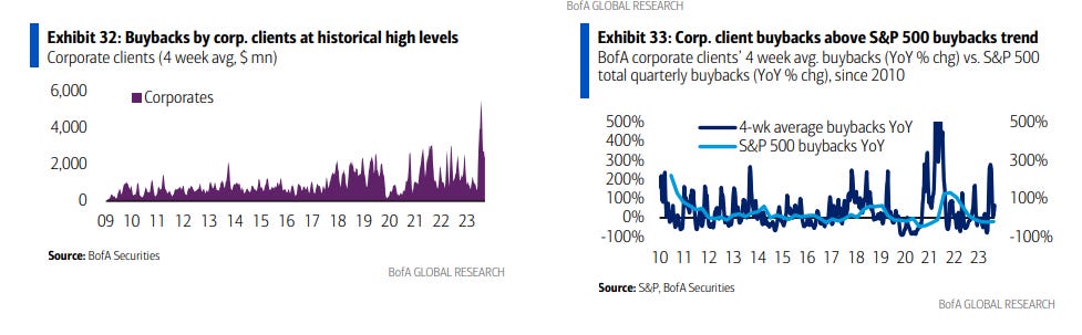2- Las recompras de acciones por parte de clientes corporativos se aceleraron, pero se sitúan por debajo de los niveles estacionales típicos por primera vez en 14 semanas. En lo que va de año, las recompras como porcentaje de la capitalización bursátil del S&P 500 (0,30%) están por encima de los máximos de 23 (0,27%) en este momento.
