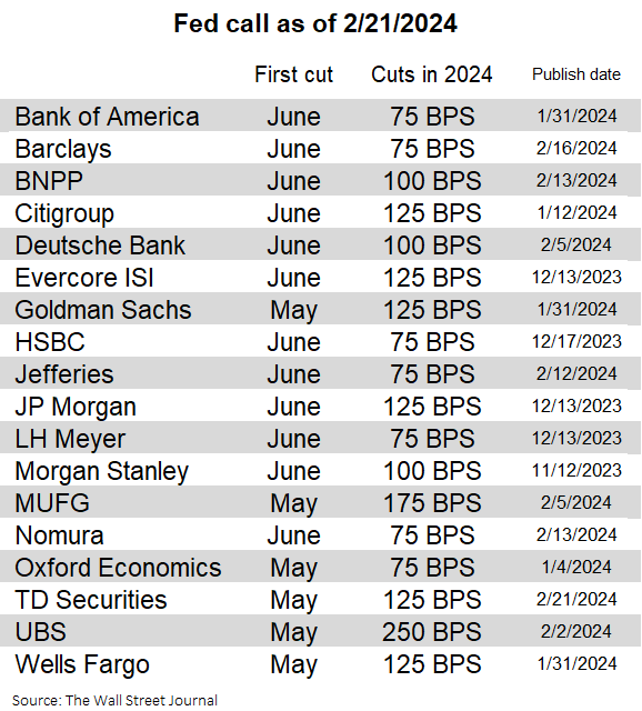 3- Barclays, BNPP, Jefferies y Nomura han retrasado a junio la fecha prevista para el primer recorte de los tipos de interés en Estados Unidos. Este recuento informal de bancos y otros analistas de la Reserva Federal ve ahora más probable el primer recorte en junio que en mayo.