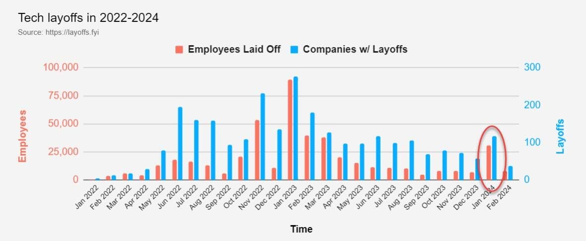 Sorprende sobre todo dado la gran cantidad de despidos anunciados por muchas compañias tecnológicas y de información las últimas semanas. Quizás no se han contabilizado, o quizás son simples anuncios y no se han oficializado, quien sabe.