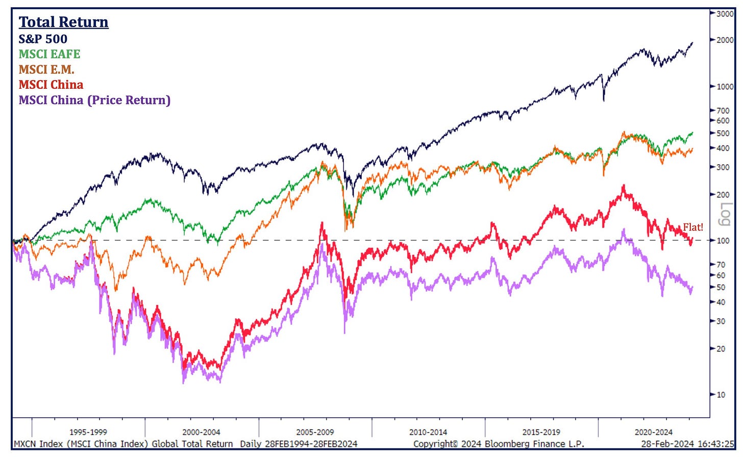 Este gráfico muestra por qué: En los últimos 30 años, el índice MSCI China ha registrado una rentabilidad total del 0%.