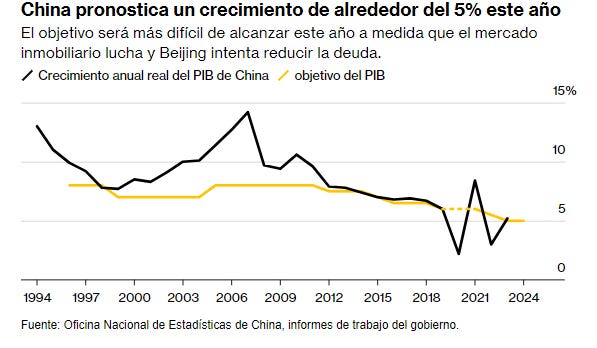 El objetivo de producto interno bruto (PIB) cumplió con las expectativas de los economistas para que Beijing repitiera el objetivo del año pasado, pero será más difícil de lograr debido a una base de comparación más alta en 2024.