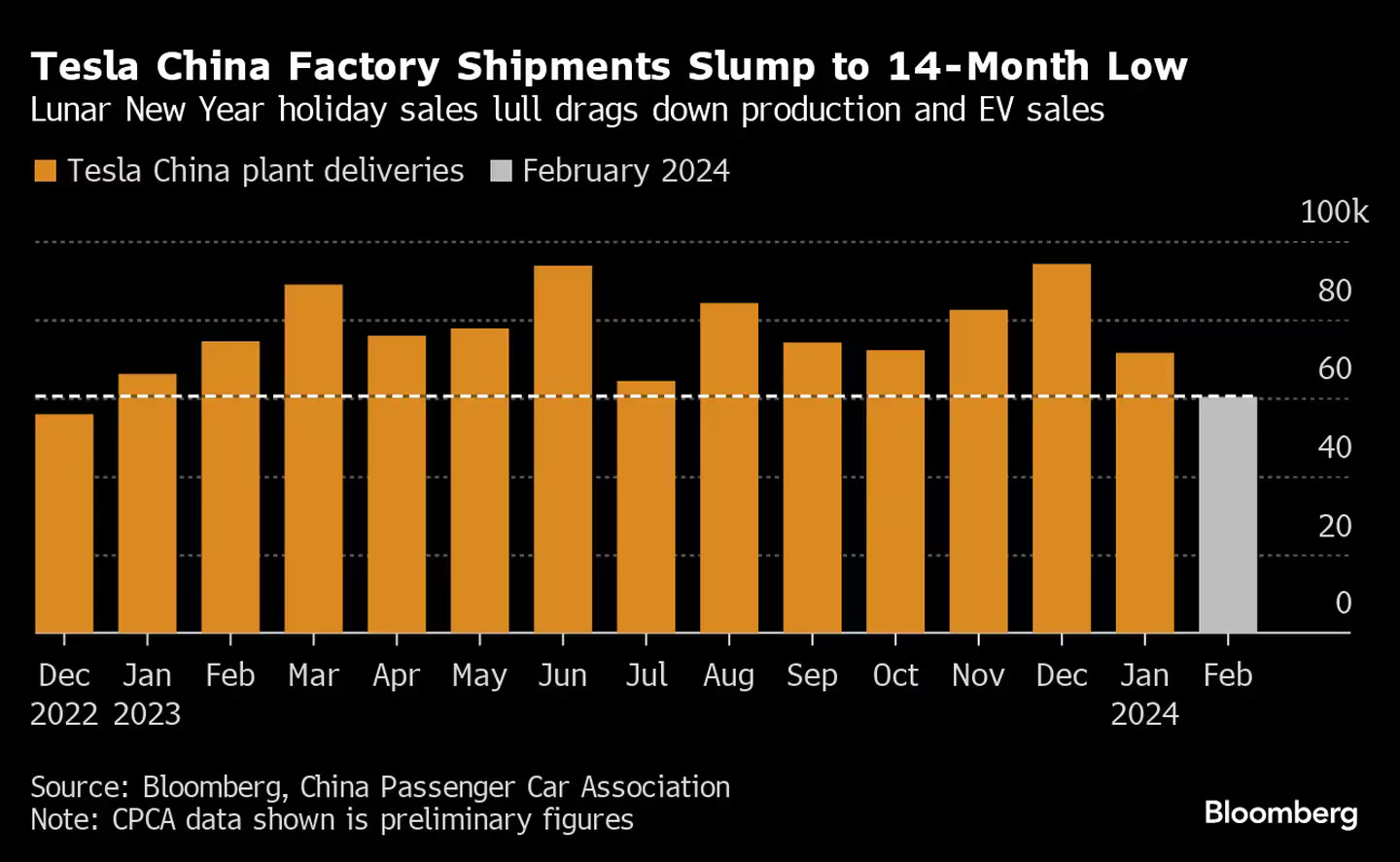 6- Los envios de Tesla desde su fábrica de Shanghái se desplomaron a su nivel más bajo en más de un año, debido a la pausa por las fiestas de Año Nuevo Lunar y la alta competencia. Entregó 60325 vehículos, la cifra más baja desde diciembre de 2022 y un descenso intermensual del 16%.