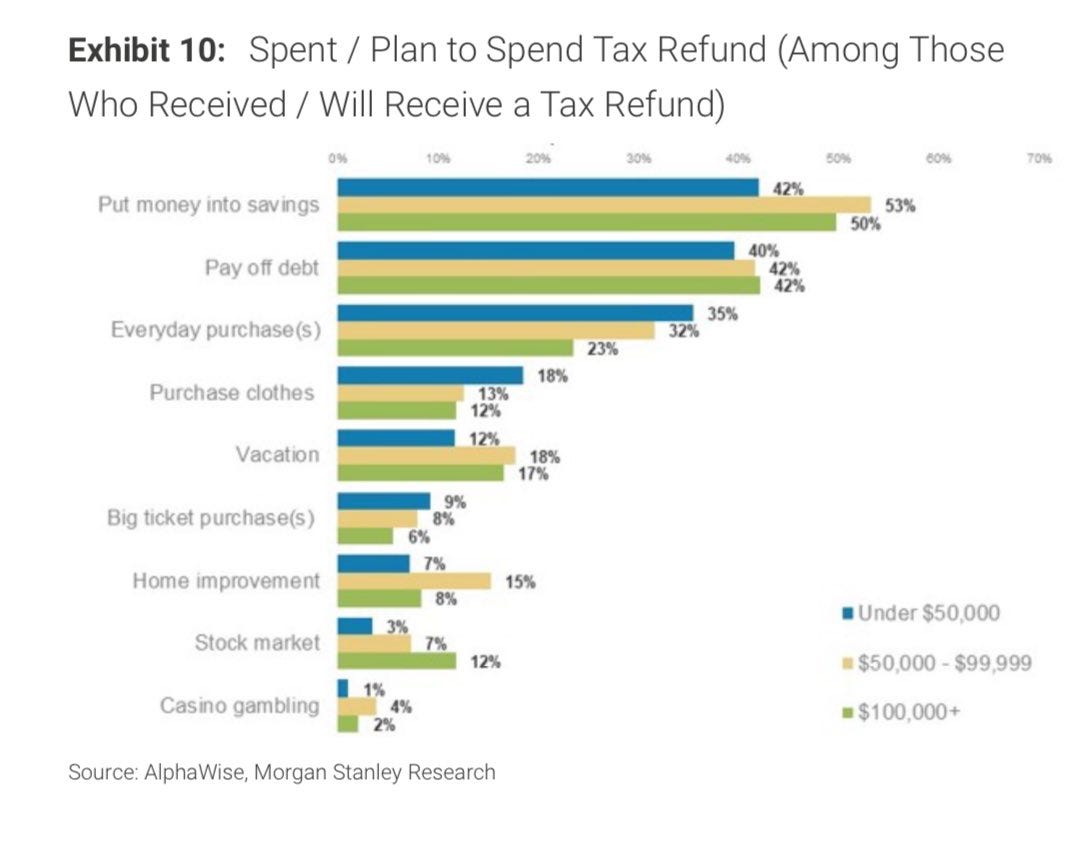 1- MORGAN STANLEY: Los reembolsos de impuestos de este año "son iguales a los de 2019 y 2023. En cuanto a lo que los consumidores planean hacer con esos reembolsos", nuestra encuesta indica que "casi la mitad .. destinará al menos una parte a ahorros .."