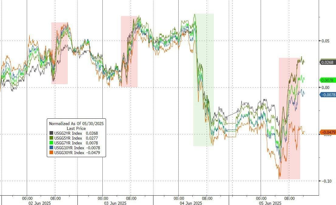 Los bonos se vendieron a lo largo de la curva (incluso cuando las acciones cayeron), con la parte media rezagada: los 5 años subieron +7 puntos básicos, los 30 años, +1 punto básico.