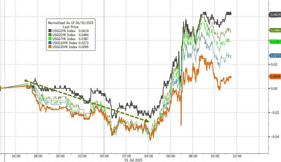 Los rendimientos de los bonos del Tesoro se dispararon hoy tras algunas compras nocturnas. Las tasas comenzaron a subir tras los comentarios de Powell y luego se dispararon al superar las expectativas del ISM/PMI (aparentemente ignorando los desalentadores datos de construcción). Los bonos a largo plazo tuvieron un rendimiento inferior.