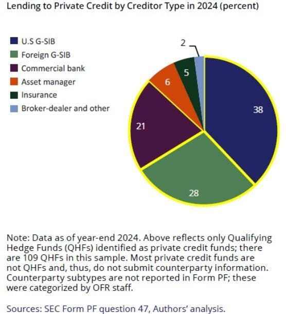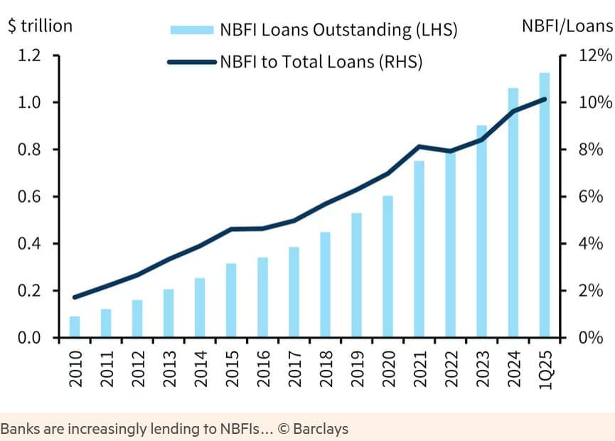 Los préstamos bancarios a instituciones financieras no bancarias han aumentado considerablemente en los últimos uno o dos años, con obligaciones que superan los 200.000 millones de dólares, según el BIS. La Oficina de Investigación Financiera llega a una estimación aún mayor, que incluye los préstamos a vehículos de propósito especial (SPV): entre 410.000 y 540.000 millones de dólares en exposiciones bancarias y no bancarias al crédito privado, la mayor parte proveniente de este último.