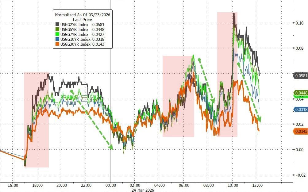 Los rendimientos de los bonos subieron durante la sesión, aunque los comentarios de Trump añadieron algo de presión vendedora al final de la misma. Este movimiento se incrementó al cierre tras las noticias desde Israel sobre un posible alto el fuego de un mes, aunque los rendimientos siguen cerca de niveles límite.
