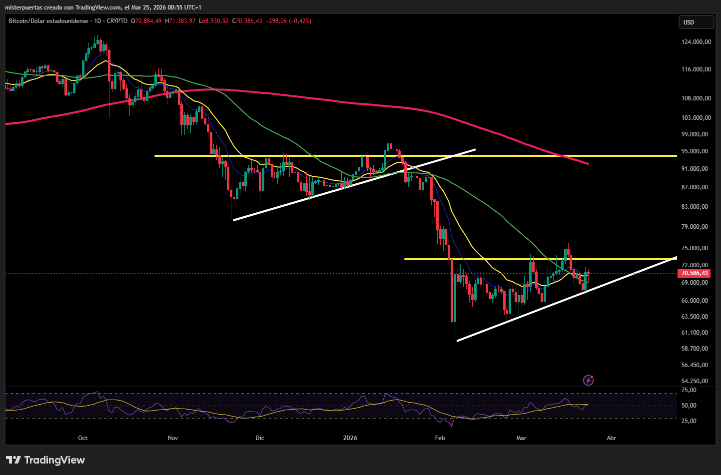 Bitcoin mostró debilidad y sigue cotizando por debajo de los 70.000 dólares.
