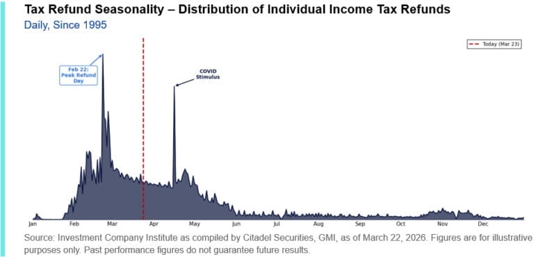 Nos encontramos en plena temporada de devoluciones de impuestos, con el 53 % de las devoluciones anuales emitidas antes del 1 de abril y aproximadamente el 75 % a finales de ese mes. Los datos de flujos minoristas de Citadel Securities muestran que esto históricamente ha coincidido con un repunte de la actividad minorista.