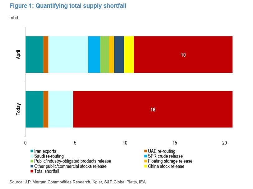 Analistas de JPMorgan estiman que la situación actual deja casi 16 millones de barriles diarios de suministro de petróleo fuera del mercado mundial.