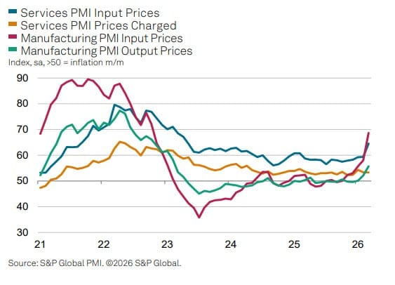 Además, los precios fueron un foco clave ante el aumento de los precios de la energía, y ya estamos viendo señales claras del impacto del conflicto entre EE. UU. e Irán. En particular, los costes de los insumos aumentaron al ritmo más rápido desde febrero de 2023, con una inflación más intensa tanto en el sector manufacturero como en el de servicios.