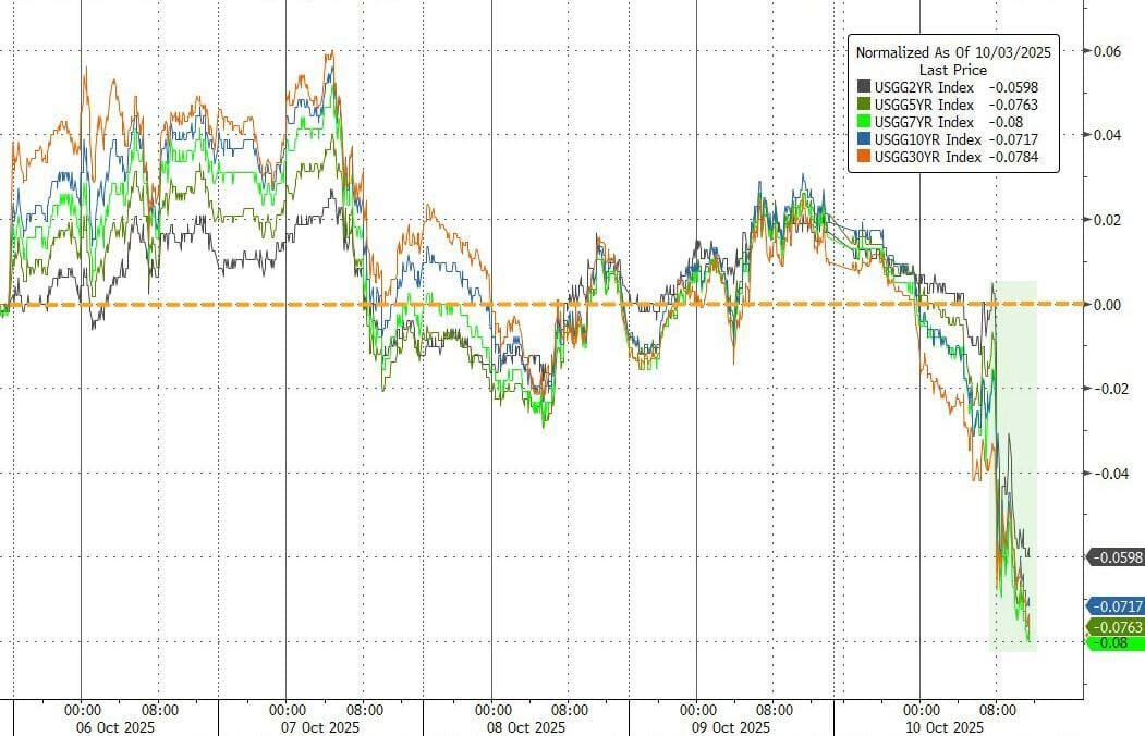 El viernes se ofrecieron bonos del Tesoro de forma agresiva, ya que las acciones se desplomaron y toda la curva bajó entre 6 y 8 puntos básicos en la semana. (Recordatorio: los mercados de bonos estarán cerrados el lunes).