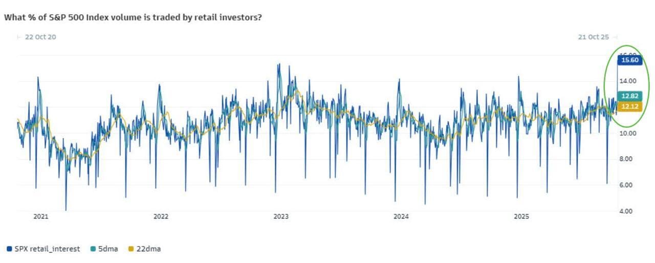 Dicho esto, parece que el minorista sigue muy activo: ayer se registró el porcentaje más alto de volumen del SPX negociado por inversores minoristas en los últimos cinco años, según Goldman Sachs.