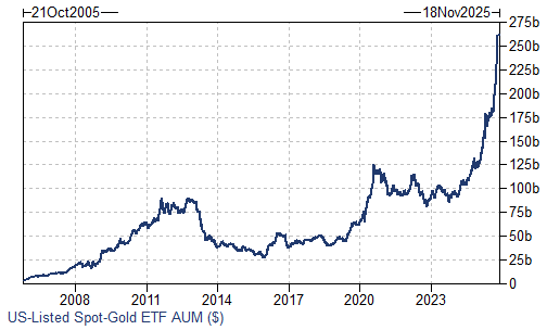 En los últimos 3 meses, se concentró más de la mitad de las entradas en ETFs de oro físico del último año. Los activos bajo gestión (AUM) de ETFs en EE. UU. casi se duplicaron desde febrero.