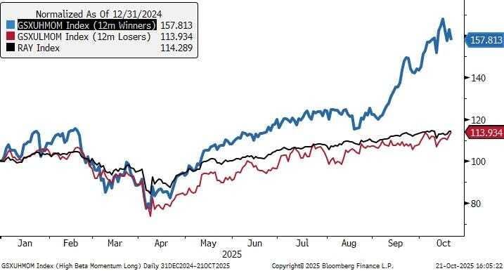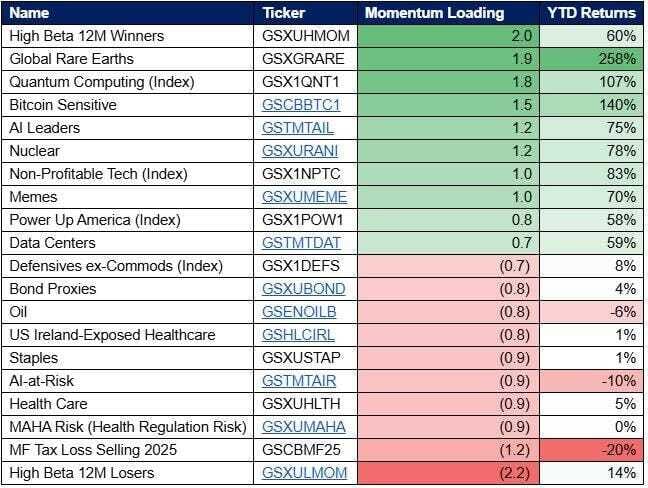 El rendimiento del Momentum este año ha sido muy fuerte (el factor puro +7%, las cestas de Goldman +15% a +35%), pero ha estado impulsado principalmente por la pierna larga (empresas ganadoras), que ahora podría sufrir más ventas conforme los gestores protegen beneficios de cara al cierre del año.