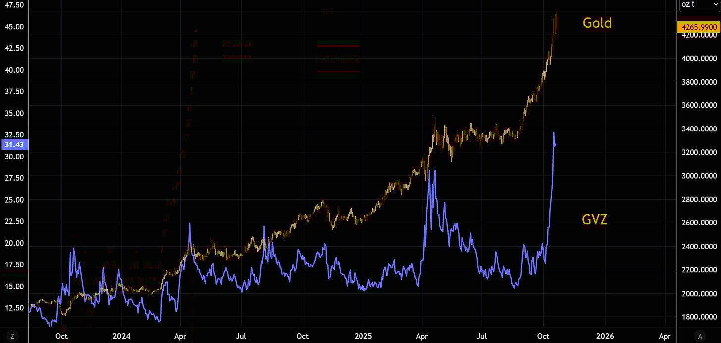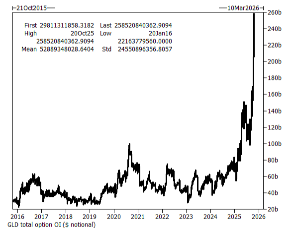 Además, los especuladores entraron en masa al mercado de opciones. El interés abierto en opciones de GLD está en máximos históricos. Muchos entraron tarde, vía calls, buscando subirse a la tendencia.